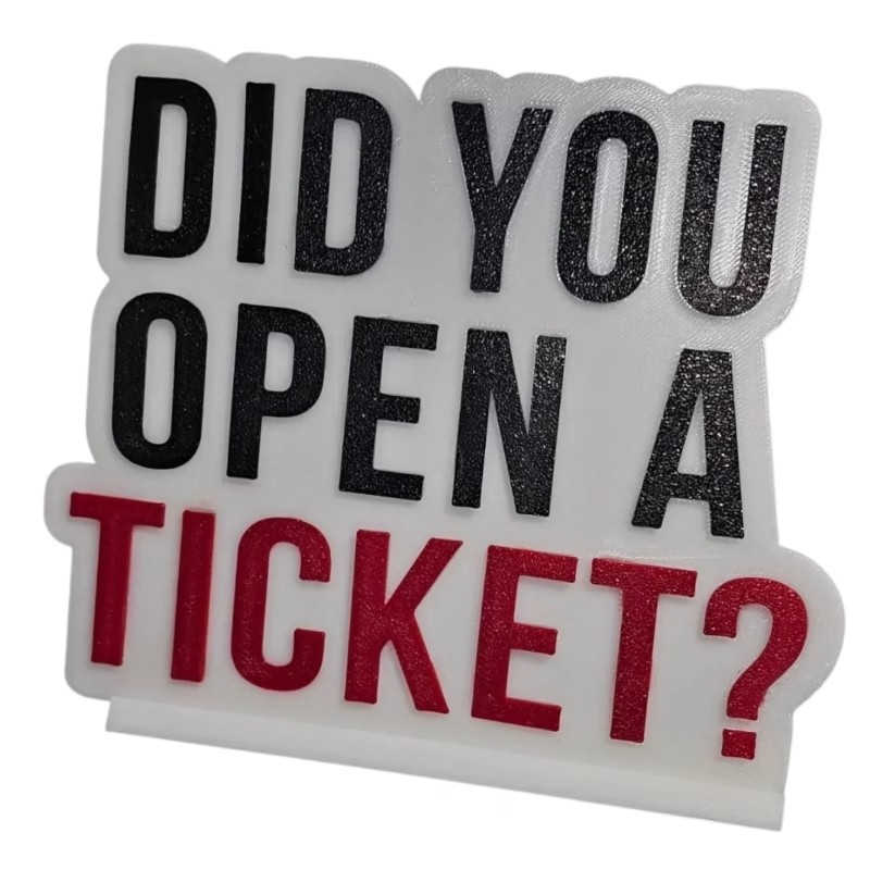 Inject some humor and personality into your workspace with this bold and witty “Did You Open a Ticket?” IT desk sign – the perfect reminder for coworkers, clients, and office visitors alike. Expertly 3D printed in Quebec, Canada by D-CENTRAL TECHNOLOGIES, this freestanding sign adds a playful yet purposeful touch to any helpdesk or tech support station. Its eye-catching text is designed to spark laughs and ward off unsolicited tech rants by reinforcing the one sacred rule: open a ticket first! Ideal for IT departments, sysadmins, network engineers, and helpdesk warriors, this desk sign isn’t just a funny gag—it’s a real conversation starter and an essential accessory for anyone tired of repeat requests without documentation. Built with vibrant dual-color filament for contrast and printed with meticulous detail, this desk sign is both sturdy and stylish. Whether you’re buying for yourself or gifting it to the favorite IT professional in your life, this sign is a must-have addition to any techie’s desk.