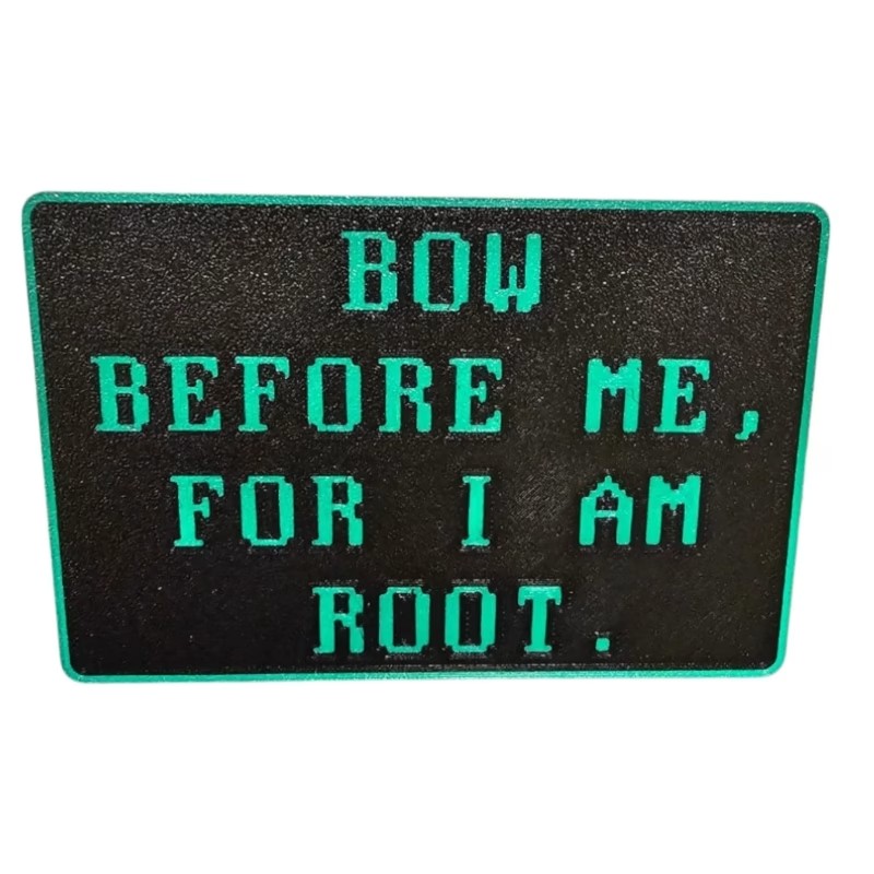 Unleash your inner sysadmin with the “I Am Root” sign, the ultimate flex for IT pros, hackers, coders, and Linux lovers alike. Featuring the bold phrase “Bow Before Me, For I Am Root,” this expertly 3D printed sign delivers unapologetic geek humor with every pixel-perfect layer. Crafted in Quebec, Canada, this dual-tone display piece brings attitude and nerd pride to any workstation, server room, or man cave. Designed to stand upright or mount on a wall, it’s the ideal gift for tech-savvy friends, DevOps engineers, or anyone who speaks fluent terminal. Its textured black base with cyber-green lettering ensures it pops in any setup, making it a conversation starter you’ll be proud to explain (or not). Whether you’re upgrading your battlestation or pranking your team, this sign commands attention—just like root should.