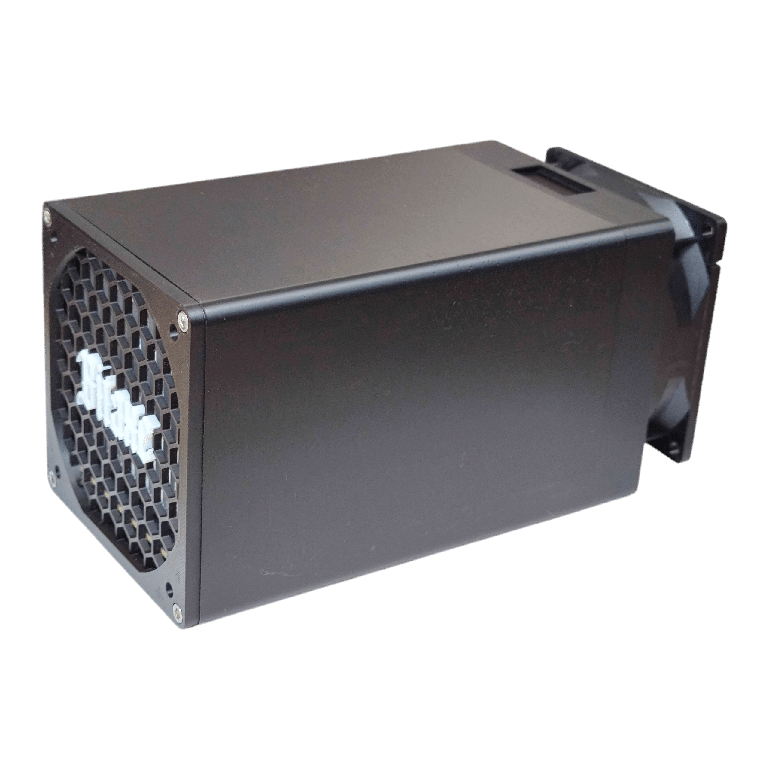 The Hex uses an Arctic P8 80mm fan and operates at approximately 45-50 dB during sustained mining — similar to a quiet conversation or a desktop PC under light load. After thermal stabilization (typically a few hours of operation), the fan speed adjusts downward and noise settles. It is designed for home operation and most users report it as unobtrusive in an office or living space.